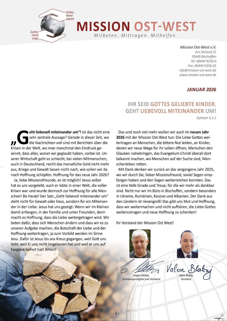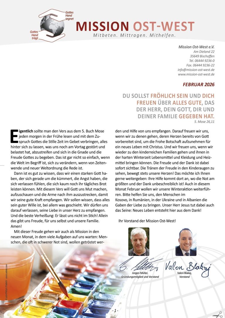 In unseren monatlichen Freundesbriefen berichten wir aus den verschiedenen Bereichen und Ländern unserer Arbeit in Albaninien, im Kosovo, in Rumämien und der Ukraine, stellen aktuelle Spendenprojekte vor, geben Infos, um ganz konkret helfen zu können. Und ebenso finden sie in jedem Freundesbrief die neuen und aktuellen Gebetsanliegen. So sind Sie immer "Up to date" und können die Arbeit unserer Mitarbeiter vor Ort mitverfolgen.