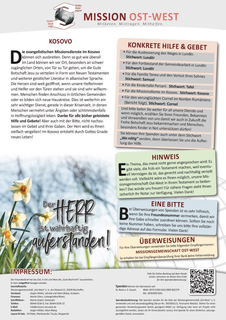 In unseren monatlichen Freundesbriefen berichten wir aus den verschiedenen Bereichen und Ländern unserer Arbeit in Albaninien, im Kosovo, in Rumämien und der Ukraine, stellen aktuelle Spendenprojekte vor, geben Infos, um ganz konkret helfen zu können. Und ebenso finden sie in jedem Freundesbrief die neuen und aktuellen Gebetsanliegen. So sind Sie immer "Up to date" und können die Arbeit unserer Mitarbeiter vor Ort mitverfolgen.
