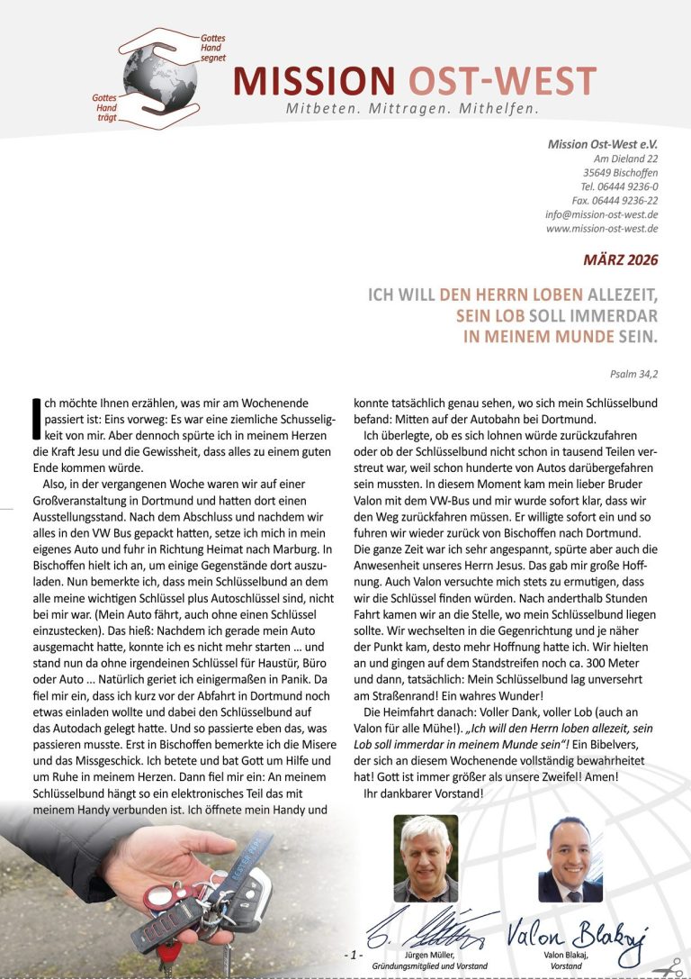 In unseren monatlichen Freundesbriefen berichten wir aus den verschiedenen Bereichen und Ländern unserer Arbeit in Albaninien, im Kosovo, in Rumämien und der Ukraine, stellen aktuelle Spendenprojekte vor, geben Infos, um ganz konkret helfen zu können. Und ebenso finden sie in jedem Freundesbrief die neuen und aktuellen Gebetsanliegen. So sind Sie immer "Up to date" und können die Arbeit unserer Mitarbeiter vor Ort mitverfolgen.